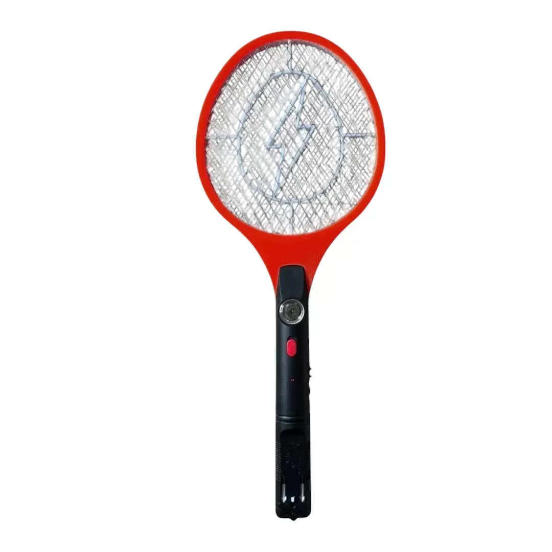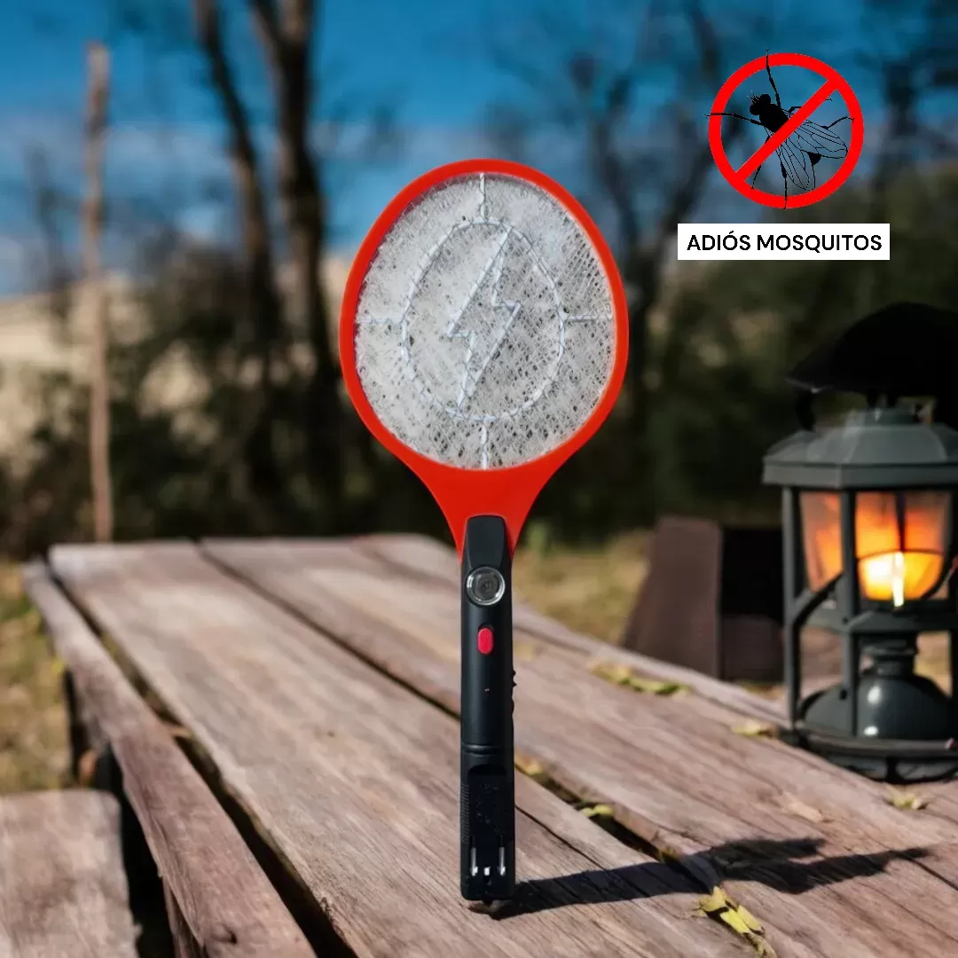 Raqueta matainsectos eléctrica recargable en color rojo, ideal para eliminar mosquitos y otros insectos voladores de manera eficaz.